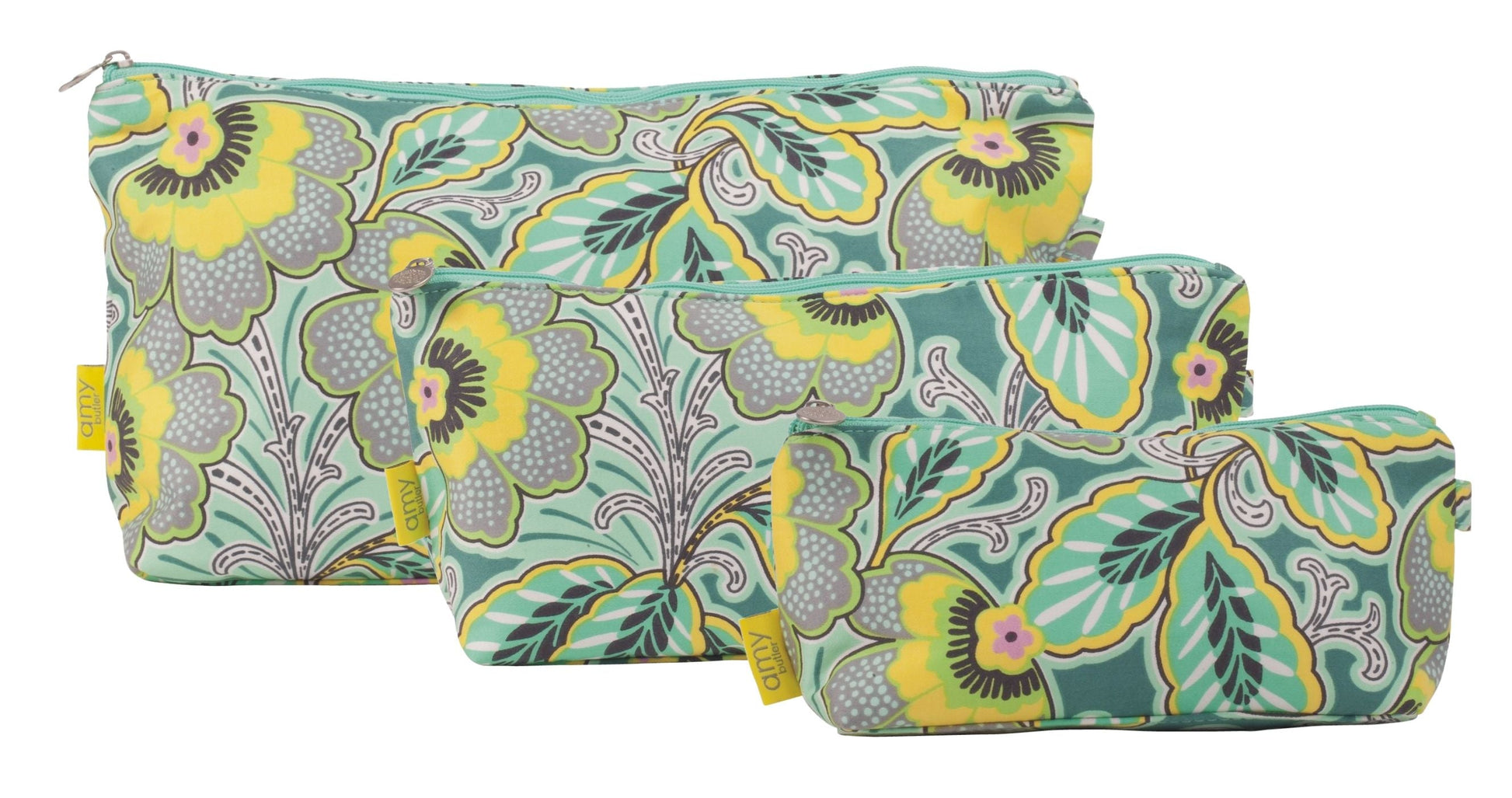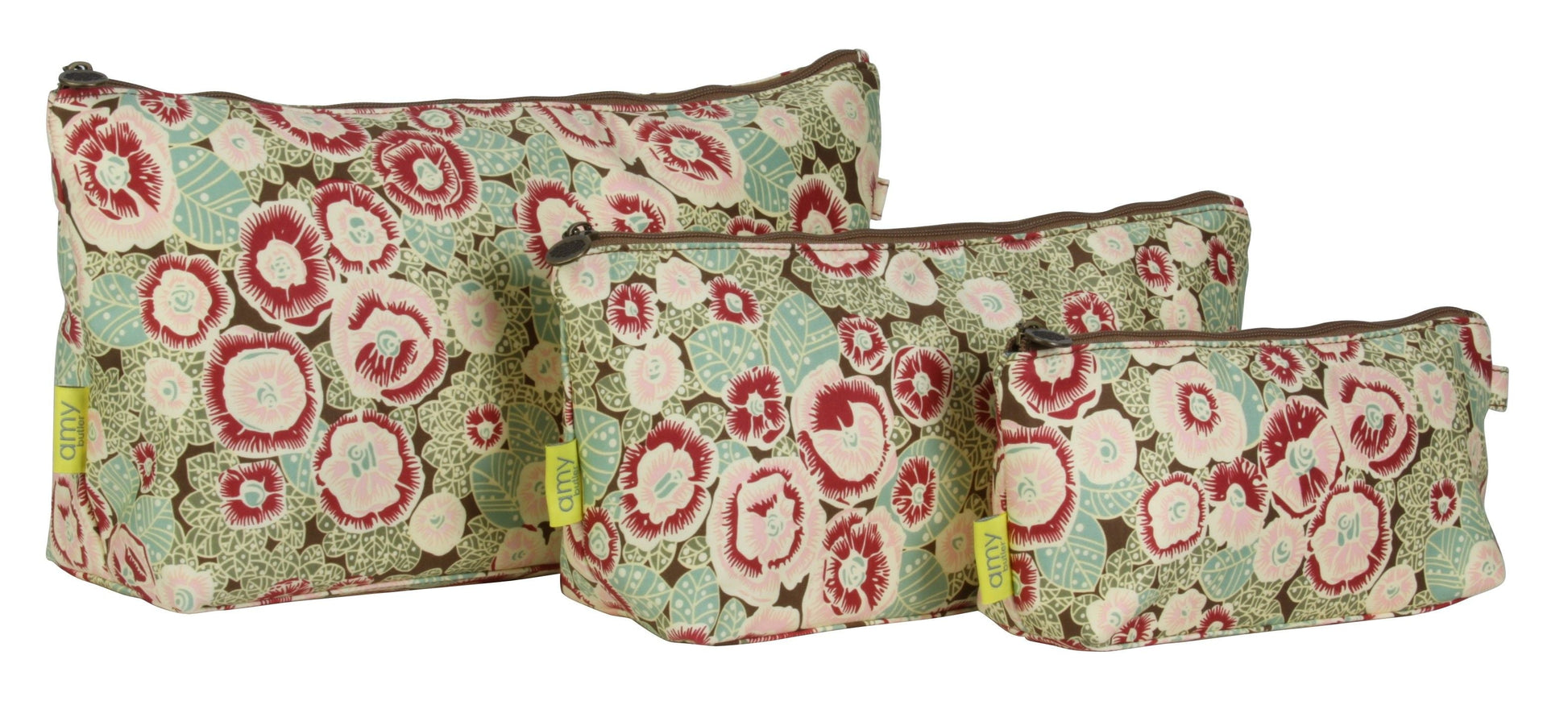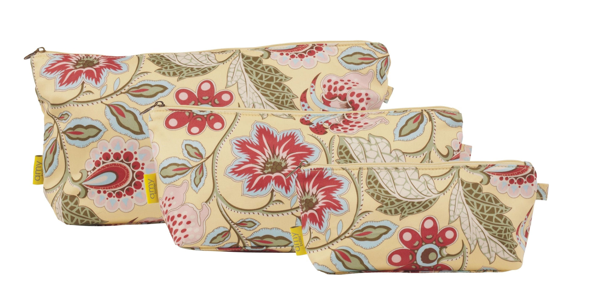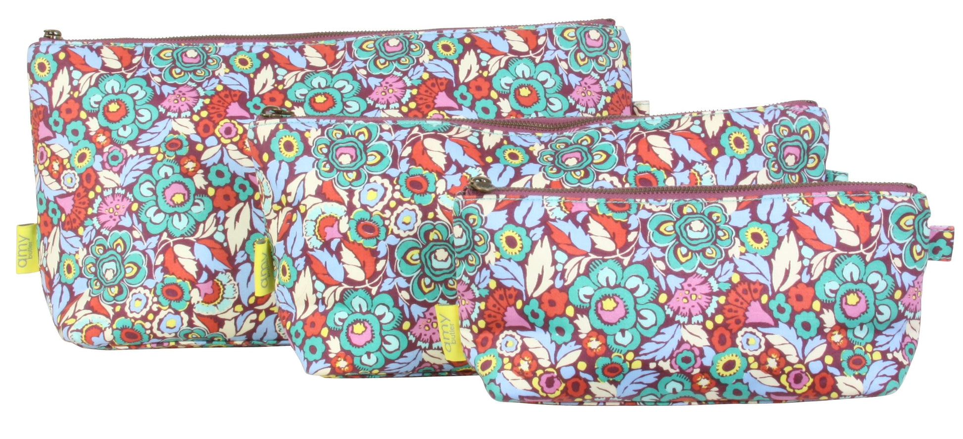 Quite simply the most limitless accessory bags for travel, home organization. Available in three sizes that are easily stowed in your luggage, drawers, purse, and yet look fabulous carried about in plain sight! The squat flat bottoms keep them open while you're digging about. Carry and organize small items inside your purse, diaper bag, or travel bag with the use of this colorful zip-top Amy Butler pouch.