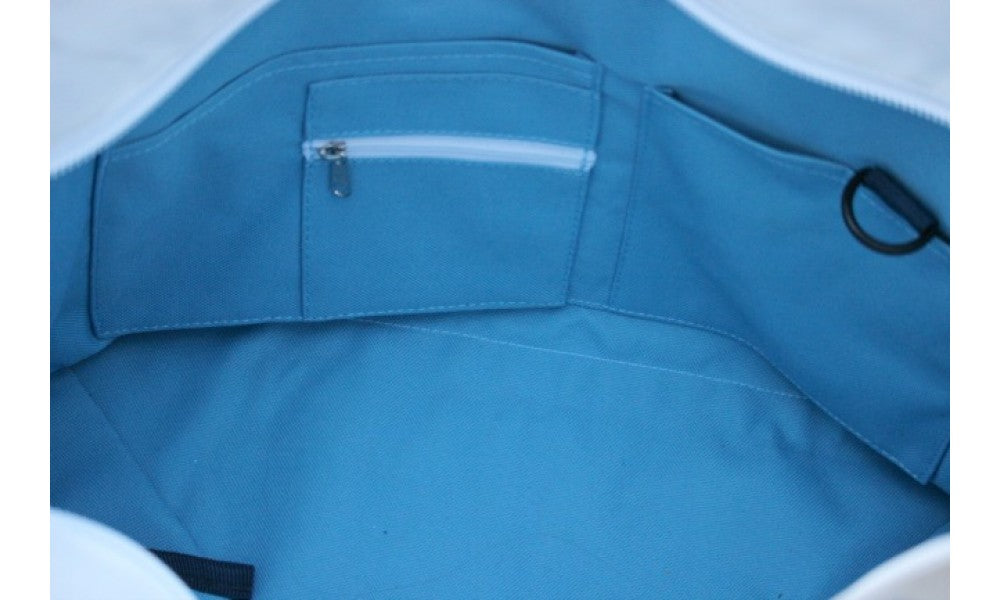 A variation of our Large Tote with a coastal flair! Top zipper closure with strong, gray straps. Inside pockets to hold your belongings. Waterproof lining to keep items dry. Perfect bag for a day at the beach!