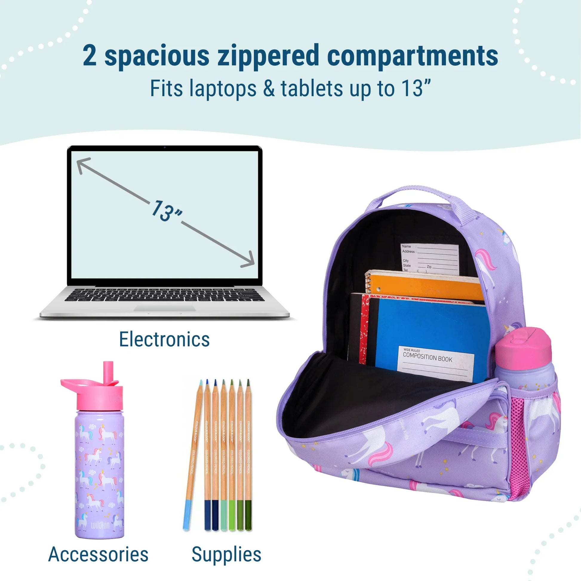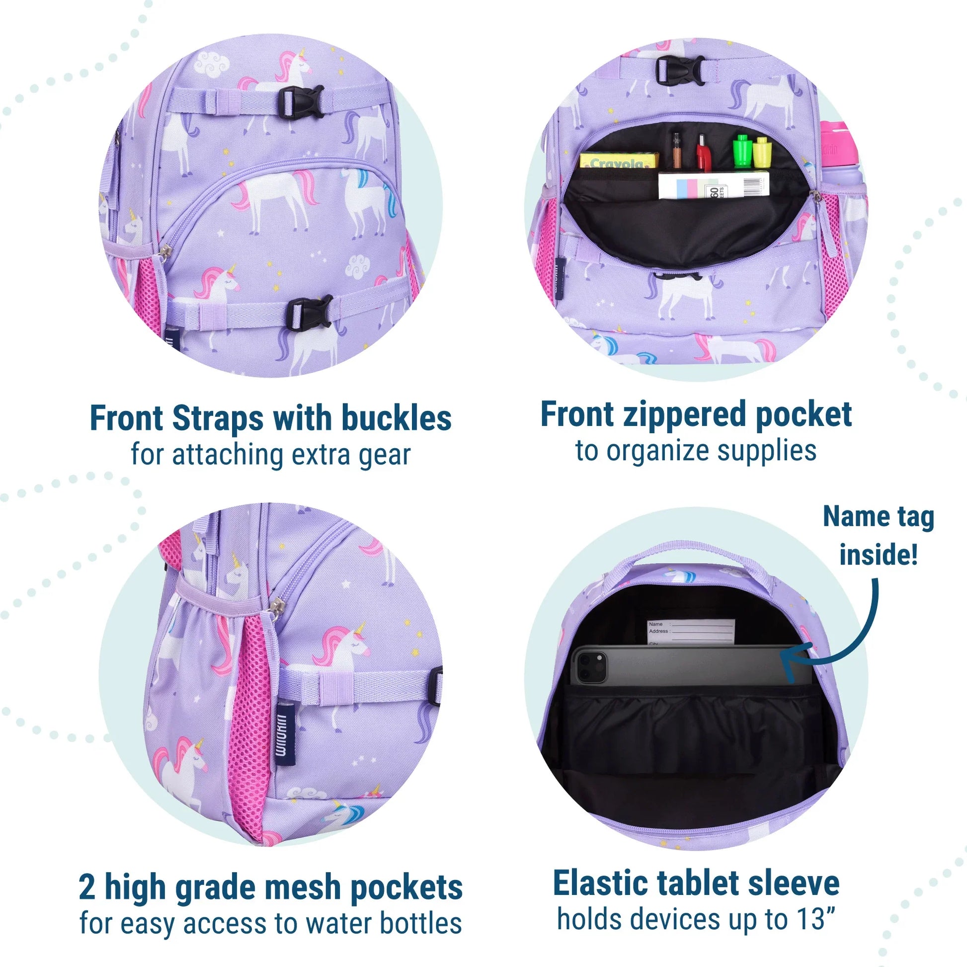 Our child will be the talk of the playground with the Wildkin Kids Eco Backpack for boys and girls! Eye-catching patterns and a functional design come together to make this backpack for boys and girls a fun addition to your child’s school and travel essentials. A recycled polyester exterior is a sustainable and durable choice, and an antimicrobial lining ensures odor-free use. Two padded, adjustable shoulder straps and a padded back provide comfortable wear, while the durable top handle is perfect for hanging in a locker before heading to class.